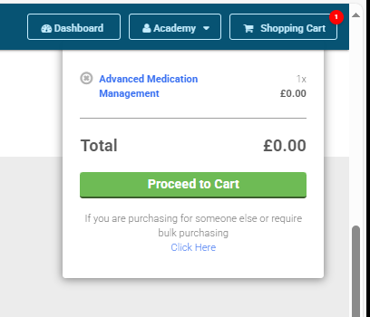 After clicking “Add”, click “Proceed to Cart” in the top right and follow the onscreen instructions to checkout. If the course is free there will be no charge and no payment details will be taken.