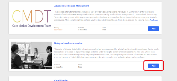 From the store you are able to view what courses are available. If you see a training course that you wish to access, click “Add” to add it to your cart. If the course is free there will be no charge and no payment details will be taken.