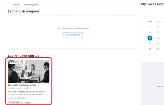 After clicking “Confirm Purchase” you will be taken to the dashboard. On the Dashboard, below "Learning not started" you will see the training you just added to your cart. Click on this training.